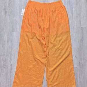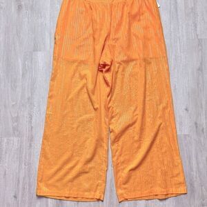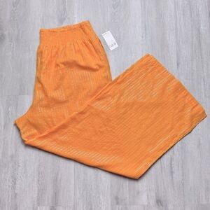 Size 2X bright turmeric yellow/gold color pull on pants. Metallic pin stripes. Pockets at sides. Elastic waist. Lined with shorts. New with tags. Waist 17in. Inseam 30in. Rise 14.5in.