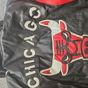 Yellow Wings 100% Leather Styled in Italy, Chicago Bulls Jacket Hooded Color Block Red Black White. Pre-owned some wear on pocket trim, on white sleeve and a small hole under the hood.