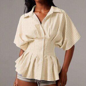 Yellow Women's Casual Minimalist Striped button down pleated Waist Shirt