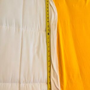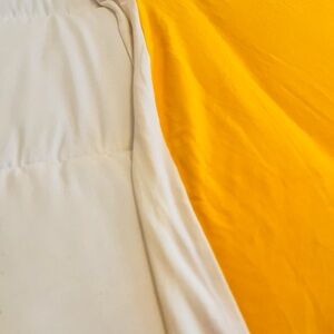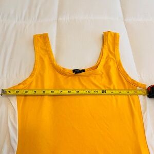 Beautiful bright yellow stretchy tank dress. White wide piping down both sides, giving a curvy slimming effect. Small spot/dot on left side, may come out in laundry (See pic) Otherwise, a great flirty fun dress for play or date. Pairs well with sneakers, flat or heeled sandals.