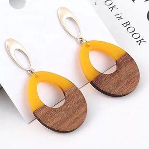 Yellow Wooden Geometric Teardrop Earrings - Acrylic Resin Lightweight Wood