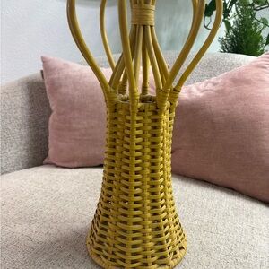 Bright yellow woven basket with a unique design. Perfect for home decor.