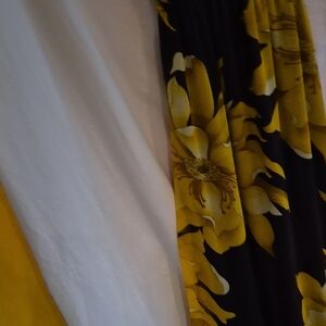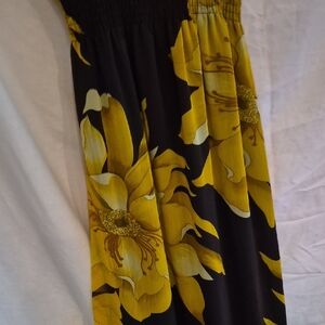 Stylish yellow and black floral dress with spaghetti straps. Perfect for a casual or dressy outing supportive bust line, lined in black,, very attractive, elastic waistline, adjustable straps.