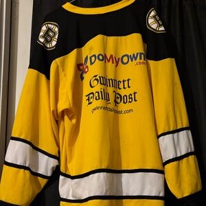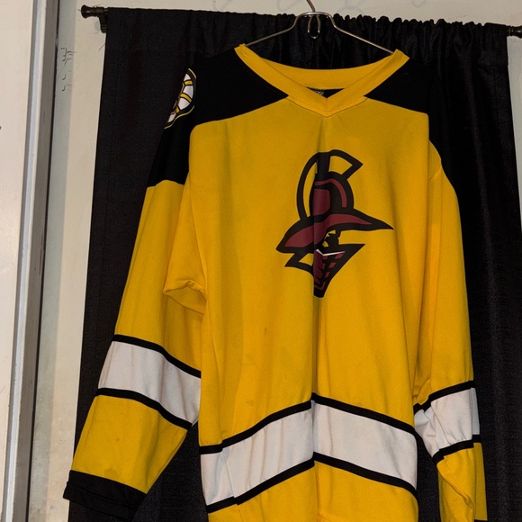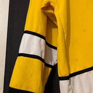 Stand out on the ice with this vibrant yellow and black hockey jersey. Perfect for fans and players alike.