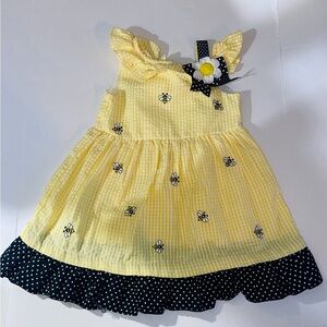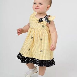 Charming yellow kids dress featuring a delightful bee pattern and black polka dot accents. Perfect for playful days.