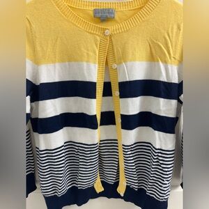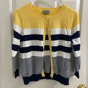 Elevate your style with this chic cardigan featuring a vibrant mix of yellow and blue hues. The medium-weight knit and classic crew neckline make it ideal for both casual and business casual settings. Its nautical-inspired design adds a touch of elegance to any outfit.