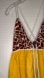 Stylish halter dress with a yellow skirt and brown patterned top. Features a rope tie detail.