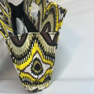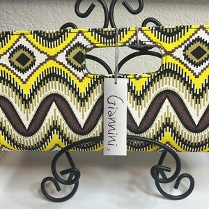Elevate your style with the clutch, featuring a vibrant yellow and brown pattern. Perfect for adding a pop of color to any outfit.
