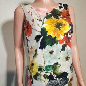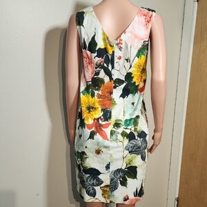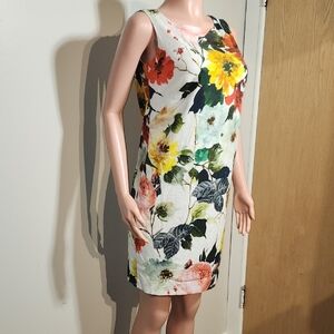 This sleeveless mini dress showcases a vibrant yellow and pink floral pattern, perfect for cocktail occasions. The scoop neckline and sheath style create a flattering silhouette, while the structured fabric ensures a polished look. Its modern design is both striking and elegant, making it a standout choice for any event.