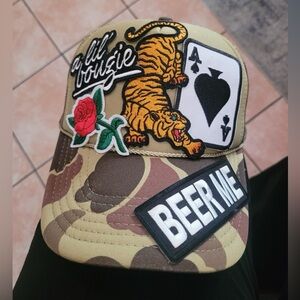 This stylish hat combines tan and yellow tones with intricate embroidered designs on the front panel, creating a unique and eye-catching accessory. The decorative elements add a touch of personality, making it a standout piece in any collection. Ideal for those looking to make a bold fashion statement.