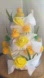 Celebrate a new arrival with this charming yellow and white diaper cake, featuring adorable rubber duckies and elegant bows. Perfect for baby showers.