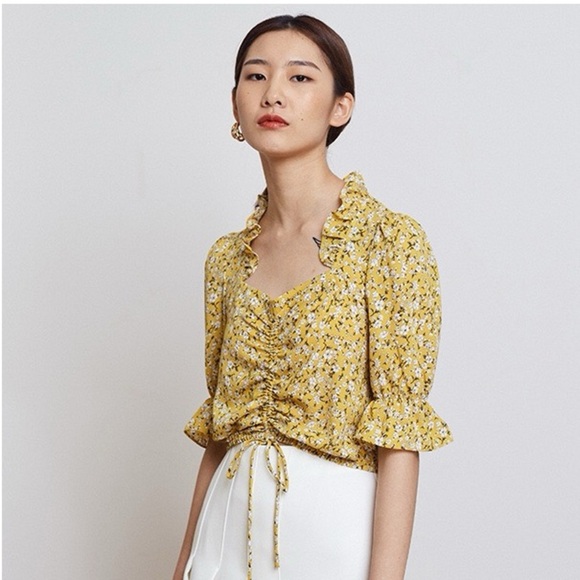 Yellow and white floral ruffle crop top with ruffle detail on the sleeve and tie up detail on the front.