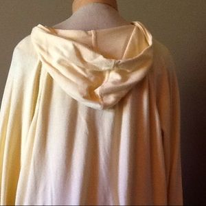 Pale Yellow and white hoodie shirt with cuffed sleeves and white bottom trim. 80% cotton, 20% nylon. Light weight sweater size 3x. Shoulder to bottom 29", shoulder across 18". New with tags.
