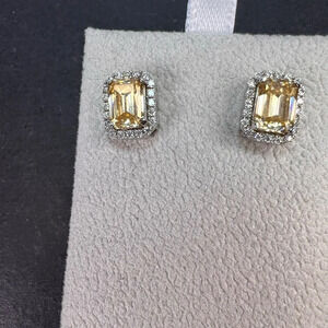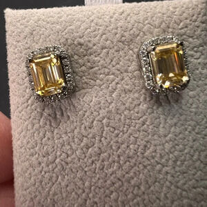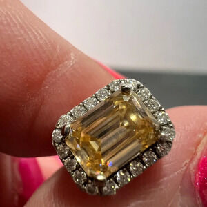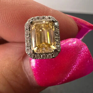 Stunning sparkling yellow octagon cut and white moissanite gemstones halo setting in rhodium plated over sterling silver. 2.35 total ctw. 925 Djoy . .39 inch in length