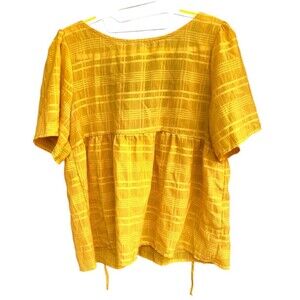 Yellow babydoll v-neck tie top, cotton blend, size M. Boho gypsy summer style. Cute lightweight plaid fabric with texture. Measurements included with photos.