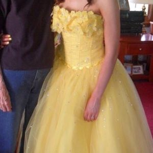 Yellow prom dress, bought from girl at school who had only worn once, and then I wore it once. Great condition girl bought it for 400 originally I then bought it from her for 250 and selling for 100 but price is negotiable. Great ball gown design princess belle inspired, flower at top of dress, corset back so size is adjustable