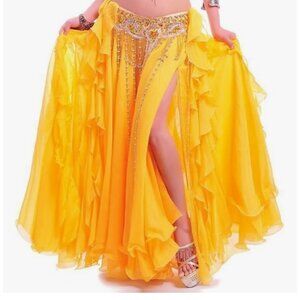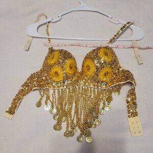 3 piece outfit, Yellow/ gold outfit comes with the long skirt, skirt overlay, and bra. Sequins & beads. Adjustable bra straps. Ruler pictured measures in inches. Size small