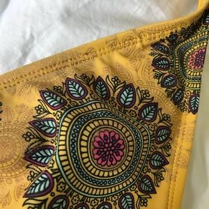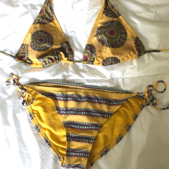 Yellow striped bottoms and bikini top with feather designs. Medium bottoms and large top.