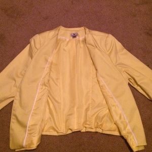 Yellow blazer perfect for the office! Is thicker material works well for fall. It is a bright yellow. Gently worn still in great shape.
