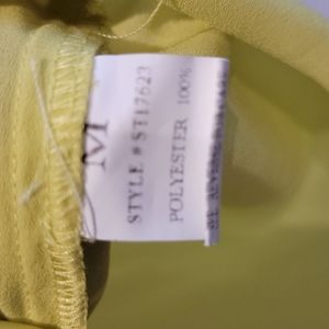 yellow blouse with faux leather detail across shoulders. half zup in the back. sheer type material