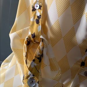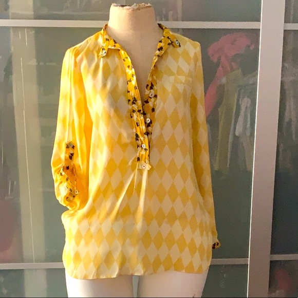 Argyle print blouse with floral detail at collar, midline and sleeve. Like new.