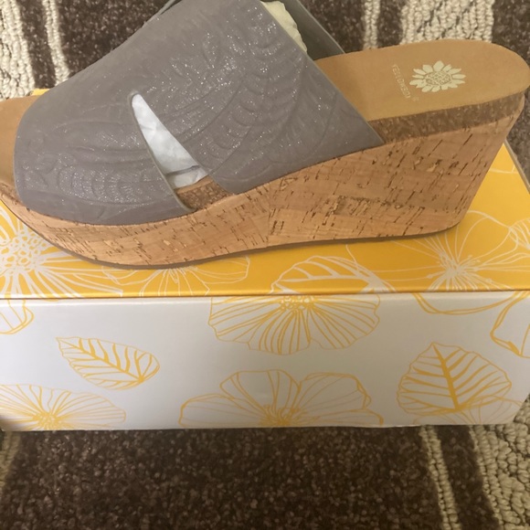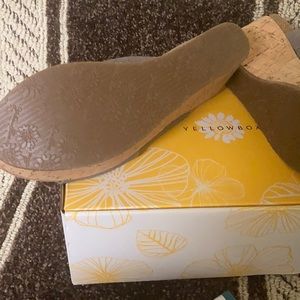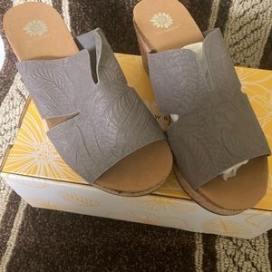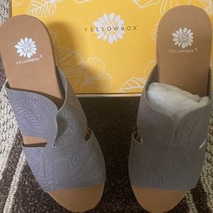Brand new with box Gray Yellow Box Slide Sandals size 7.5 M 3.0 inch wedge heel.