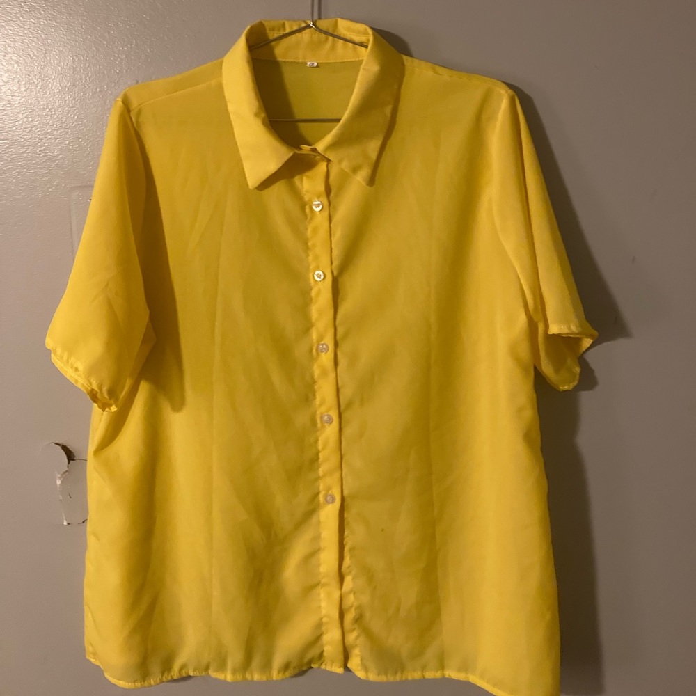Yellow button down blouse, small stain about the size of a sharpie tip, front left, not very noticeable