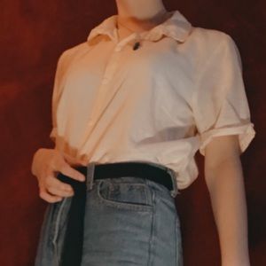 Short sleeved light yellow button up, slightly transparent