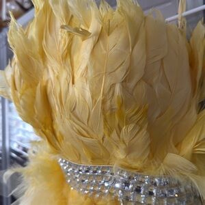 Yellow fancy feathered top party dress! Bust is 12 inches across. Super small dress. I would estimate it a size 2 to 4. I am not guaranteeing the size. Hard for me to tell on this dress.