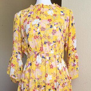 - Beautiful boho style yellow multicolored floral maxi tiered ruffle dress