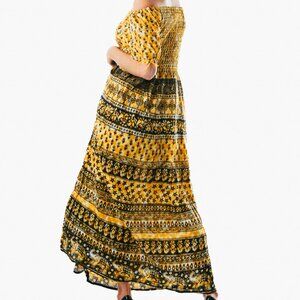 Yellow peasant maxi dress short sleeve off shoulder boho summer floral tie dye