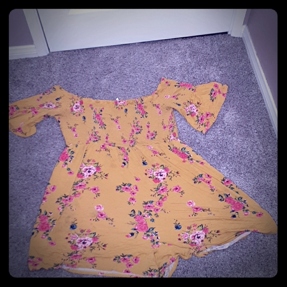 It is a yellow floral romper flowey at bottom but ruffley at the top