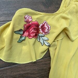 Mustard Yellow and red rose embroidered patch cold shoulder blouse. In great condition. Latin blouse.