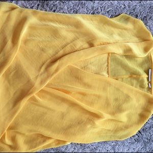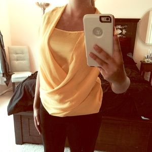 Yellow top- very flattering! It drapes right around the stomach and the color is very vibrant. Very professional, never worn