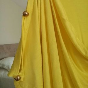Summer top in bright yellow, cowl neck, open shoulders with gold button down peekaboo sleeves, rayon/spandex. Looks long but sits on hip.