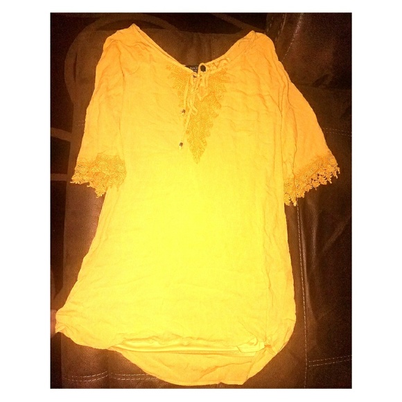 Lace detail on sleeve and around the neck and chest area beautiful alone or over pants or even a bathing suit.