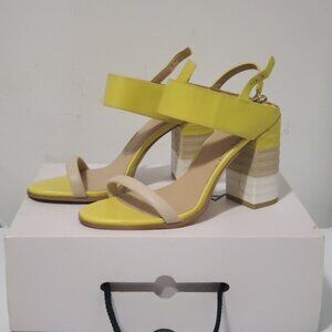Aldo yellow and white block heel open toe shoe, 8.5M. Miner wear and tear, like new in original box , classy and comfortable. wore one time briefly.