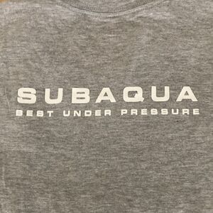 Yellow Gear Subaqua short sleeve gray T Shirt with crewneck. Back of t shirt says SUBAQUA Best Under Pressure in white lettering. Yellow Gear logo label on right sleeve. Size small. Excellent preowned condition.