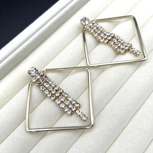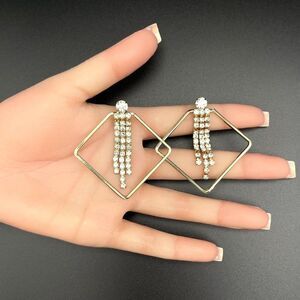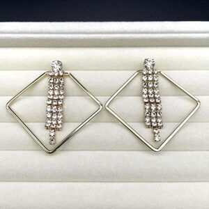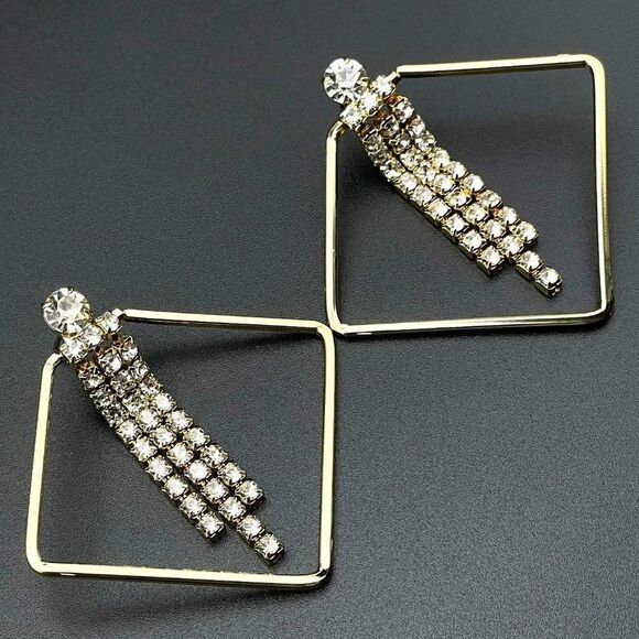 Yellow Gold Tone Rhombus Shaped Post Back Drop Earrings with Triple Dangling Tassels of White Diamond Crystals