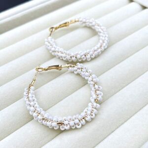 Yellow Gold Wire Wrapped White Beaded Open Round Hinged Post Hoop Earrings