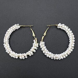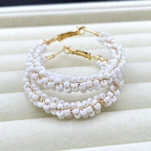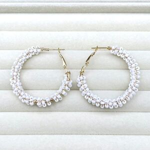 Yellow Gold Tone Round Open Hoop Hinge Post Earrings Embellished with Rows of Wire Wrapped White Beads