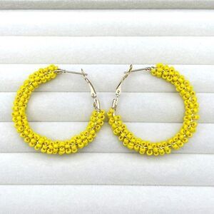 Yellow Gold Tone Round Open Hoop Hinge Post Earrings Embellished with Rows of Wire Wrapped Yellow Beads