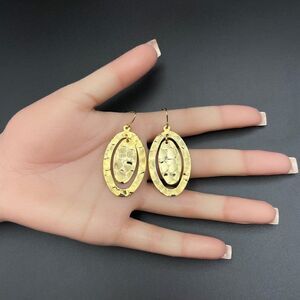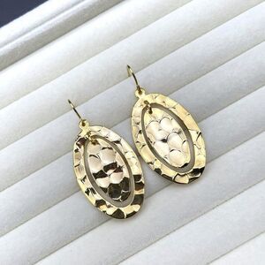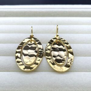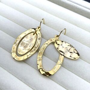 Yellow Gold Hammered Double Oval Shiny Dangling Drop Hook Earrings
