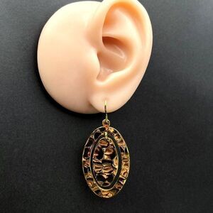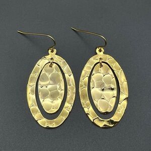 Yellow Gold Tone Hammered Double Oval Shiny Dangling Drop Hook Earrings
