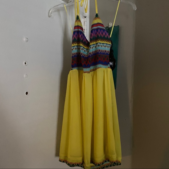 Bright Yellow Halter Dress with multicolored fabric designs on the top (and lining the bottom). Under layer to prevent sheer bottom from being see through. Perfect spring and summer dress! Does have a few snags, mainly one in the back (see picture).