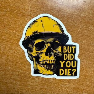 Add a bold touch to your space with this striking yellow skull sticker featuring the phrase "But Did You Die?" Perfect for personalizing your belongings.