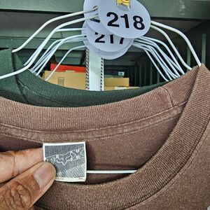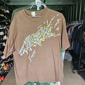 used This short sleeve tee features a striking abstract graphic design that flows diagonally across the front, set against a brown and yellow base. The relaxed fit and dynamic pattern make it a standout piece for casual wear.