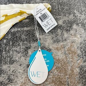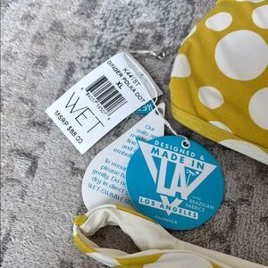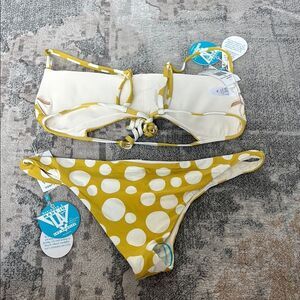 Embrace a playful retro vibe with this yellow and white polka dot bikini. The bandeau-style top with thin straps and classic bikini cut bottom offer a chic and comfortable fit. Perfect for making a splash at the beach or lounging by the pool.