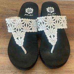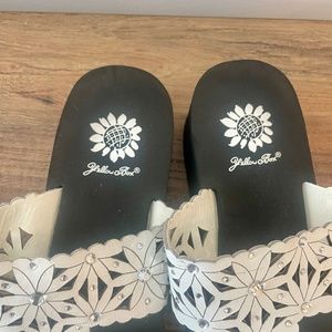 Yellowbox Platform Sandals with T Strap, Size 7.5, EUC. Black platform with white floral leather T Strap filled with rhinestones for extra bling. Yellowbox offers a mellow mat featuring resilient impact reducing footbeds.