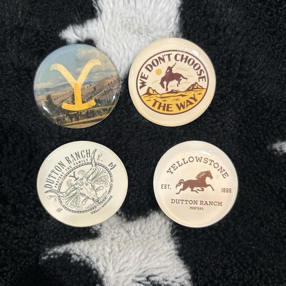 Set of four Yellowstone Dutton Ranch magnets. Features various designs and colors.